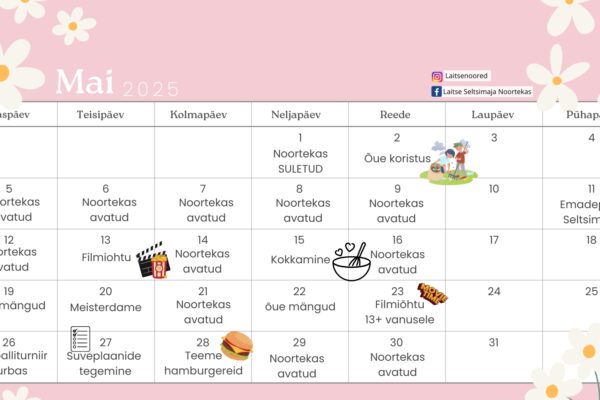 Laagri Noortetoas saavad noored ilusate ilmadega veeta aega õues, mängides erinevaid õuemänge. Tähistame emadepäeva meisterdades (07.05) ning külla on oodatud kõik emad (12.05), et osaleda lapsega ühistegevuses. Mais toimuvad veel kokkamine (05.05 & 21.05), lauamängude mängimine (27.05) ja filmi vaatamine (16.05). Lisaks on 15.05 ja 23.05 noortetoas 13+ aeg alates kell 16.